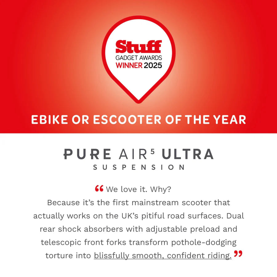 Powered by a 1100W motor, Pure Air5 Ultra suspension delivers a smooth and reliable ride with a 15.5mph (25 km/h) range on a single charge. The 10" enhanced grip tyres keep you rolling with confidence, while the IP65 waterproof rating ensures reliability in any weather. With low-maintenance, dual brakes for added safety, the Pure Air5 Ultra suspension is built for comfort, performance and dependability.